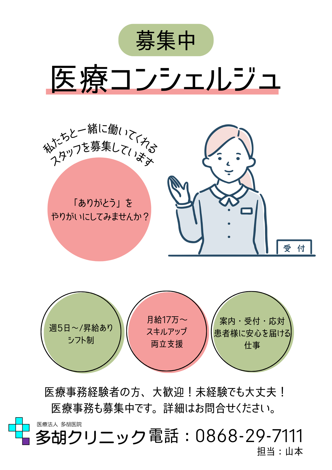 多胡クリニックでは職員を募集しております。詳細は下記ハローワークページもしくは、お電話にてお問い合わせください。
