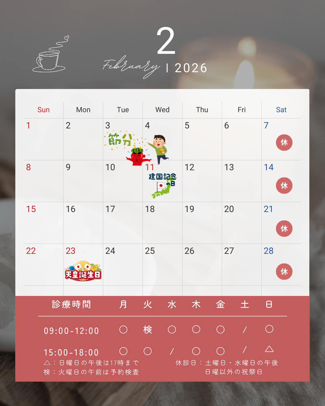 2/7(土) 2/11(水)建国記念の日 2/14(土) 2/21(土) 2/23(月)天皇誕生日 2/28(土)
